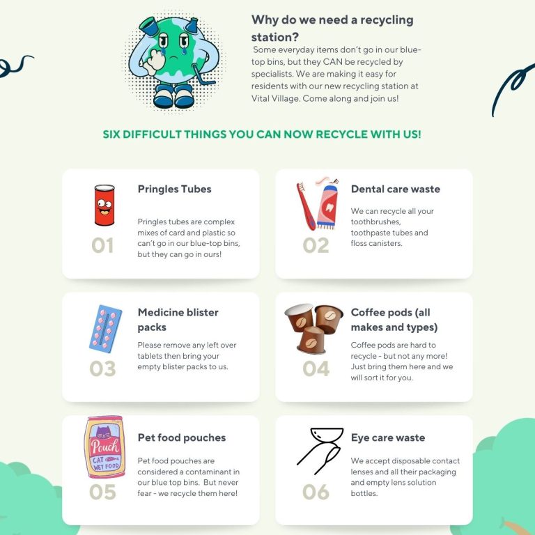 Located in Vital Village, our Recycling Station offers a local opportunity to recycle difficult items that don’t go in our blue top bins. We accept: